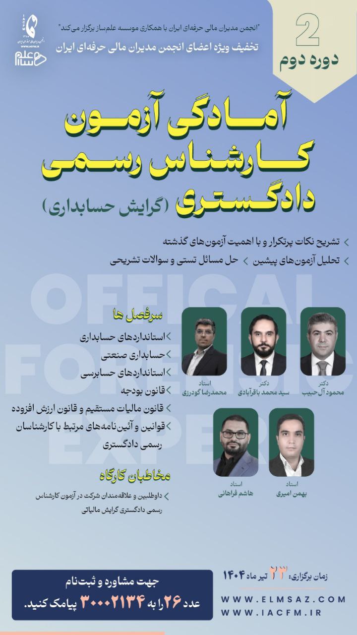 خانهدورههای آموزشی بلند مدتدوره دوم آمادگی آزمون کارشناس رسمی دادگستری گرایش حسابداری 0 از 0 رأی 8.500.000 تومان شرکت در دوره دوره دوم آمادگی آزمون کارشناس رسمی دادگستری گرایش حسابداری Category: دورههای آموزشی بلند مدت منتشر شده در ۲۳تیر ۱۴۰۴ 0 نظر به روز شده در ۲۳تیر ۱۴۰۴ اشتراک گذاری: محصولات مرتبط دوره آمادگی آزمون حسابدار رسمی 12.800.000 تومان شرکت در دوره دوره حسابداری ویژه بازار کار 8.000.000 تومان شرکت در دوره دوره قوانین و مقررات مالیاتی 12.000.000 تومان شرکت در دوره دوره مدیر ریسک حرفه ای 9.500.000 تومان شرکت در دوره دوره پرورش مدیر مالی 23.000.000 تومان شرکت در دوره دوره دوم آمادگی آزمون کارشناس رسمی دادگستری گرایش مالیاتی 7.000.000 تومان خرید محصول