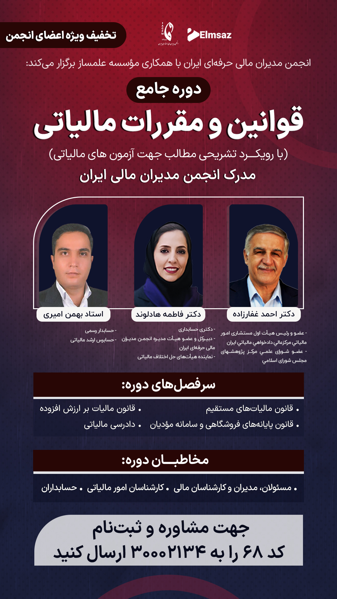دوره هوش مالیاتی برای مدیران مالی حرفهای 30.000.000 تومان قیمت اصلی 30.000.000 تومان بود.15.000.000 تومانقیمت فعلی 15.000.000 تومان است. شرکت در دوره